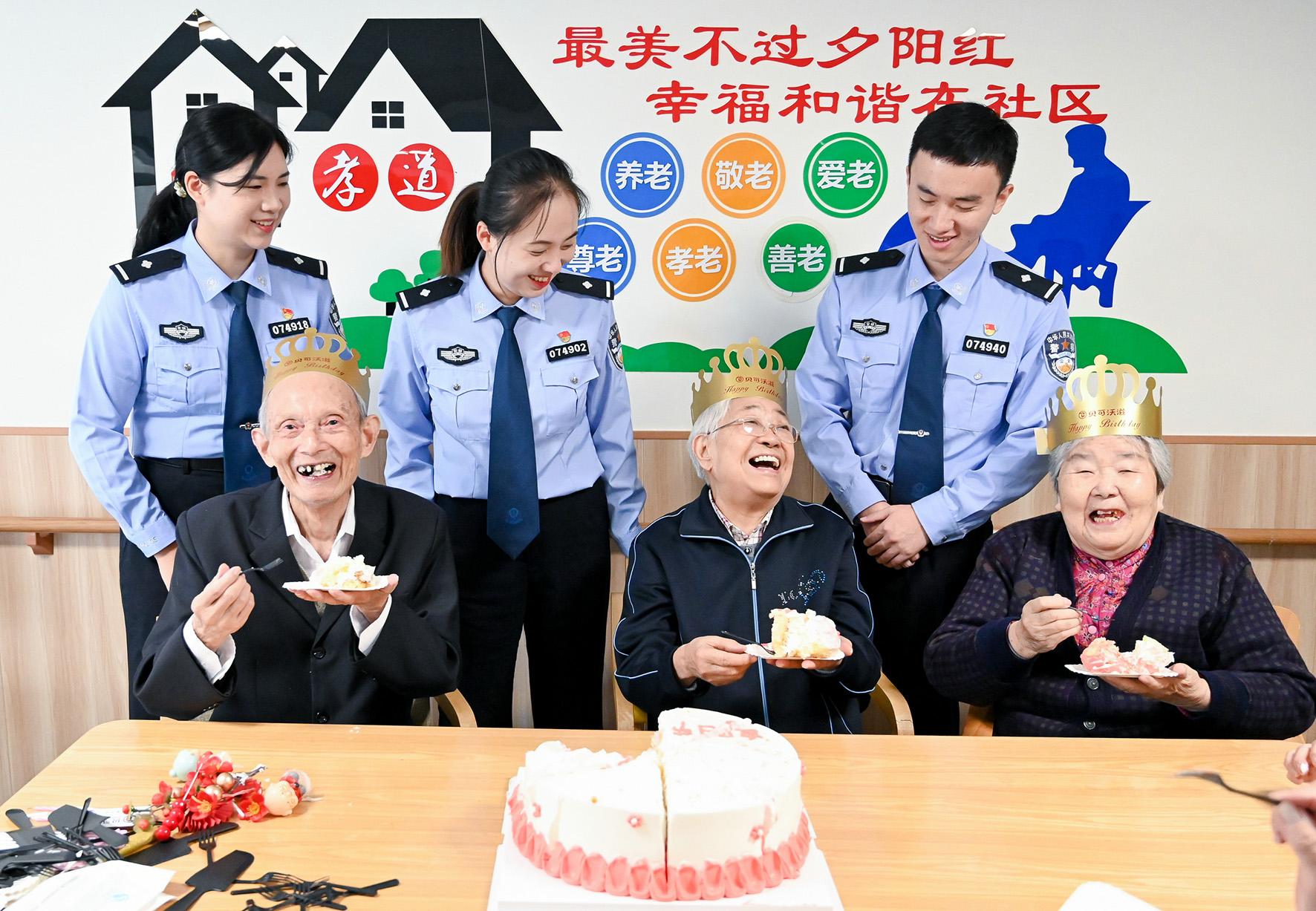 10月10日,安徽省馬鞍山市和縣公安局民警在蓮邦養(yǎng)老院與老人們喜迎重陽節(jié),開展防范網(wǎng)絡詐騙等普法宣傳。