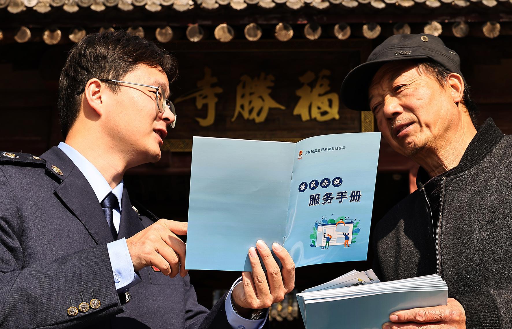 11月5日,山西省新絳縣稅務局稅宣人員在光村福勝寺向文創(chuàng)人員宣傳文創(chuàng)產(chǎn)品稅惠新政。