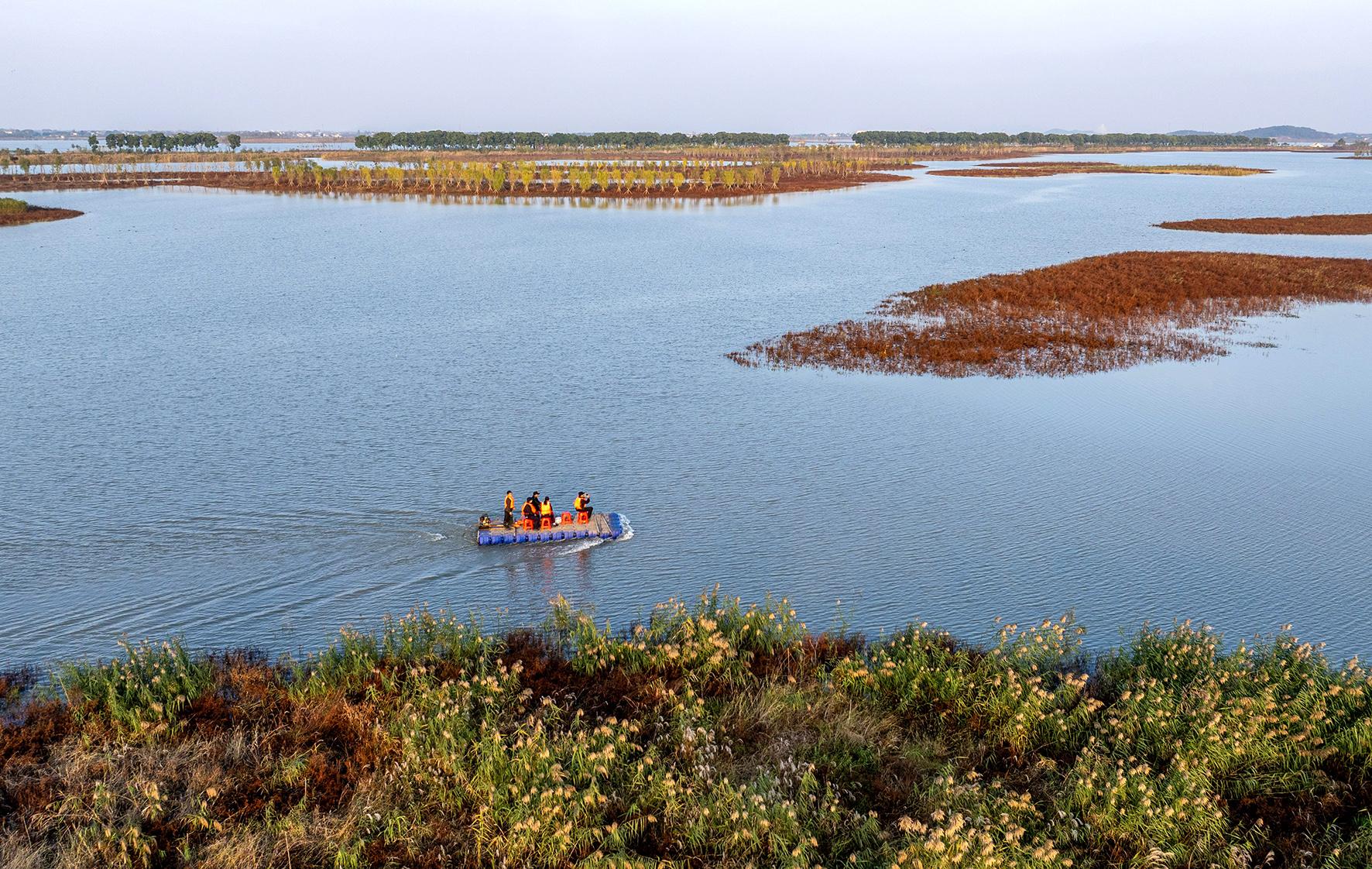 11月21日,安徽省合肥市廬江縣環(huán)境保護(hù)執(zhí)法人員在黃陂湖濕地開展水上巡查。