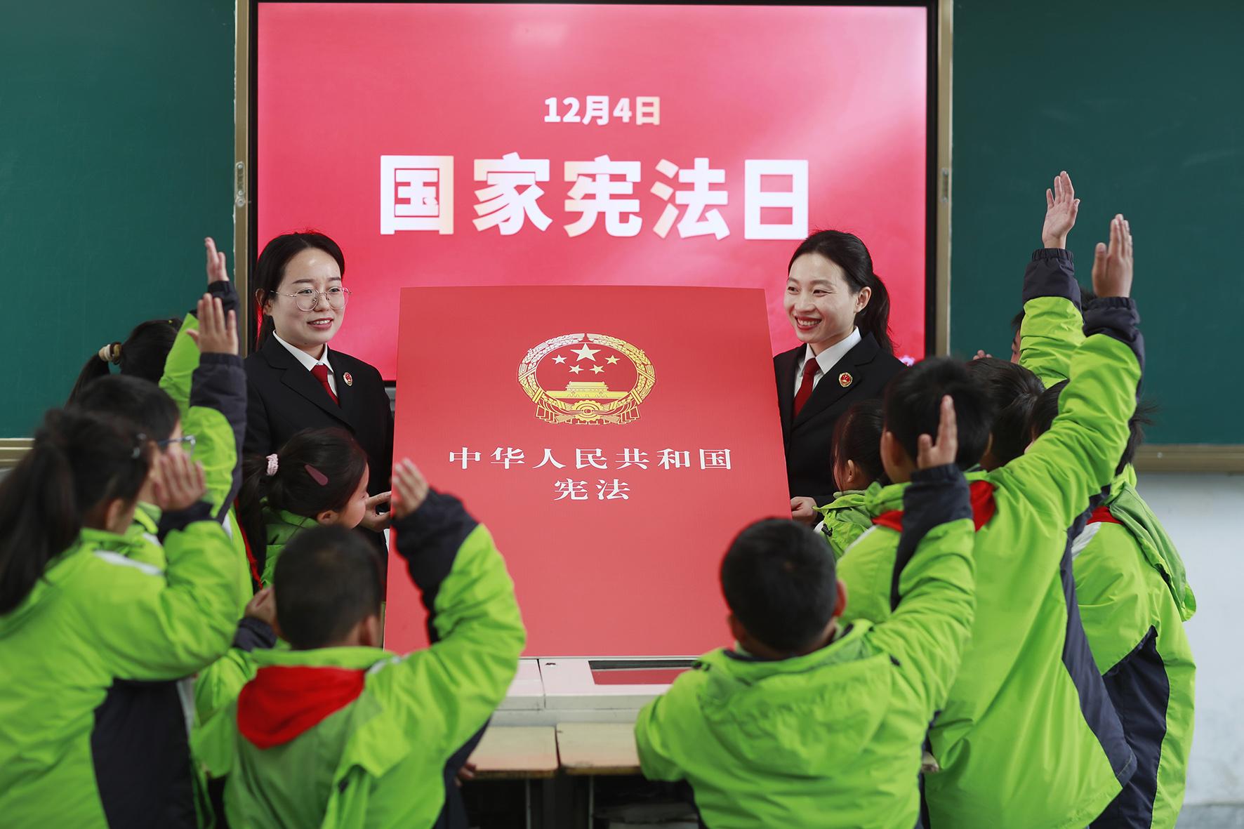 12月3日,在江蘇省興化市林湖中心校,興化市人民檢察院法治宣講團的工作人員給學(xué)生講解憲法知識。