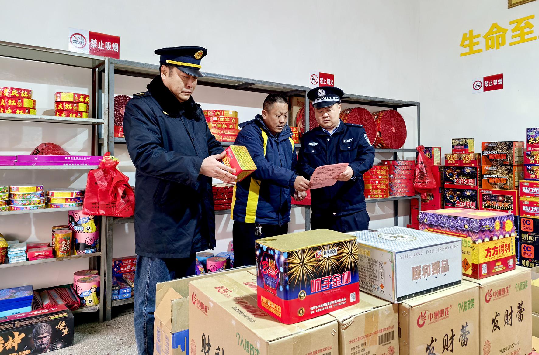 12月25日,山東省棗莊市公安局山亭分局北莊派出所民警和市場監(jiān)督管理人員對轄區(qū)煙花爆竹銷售點(diǎn)開展安全檢查。