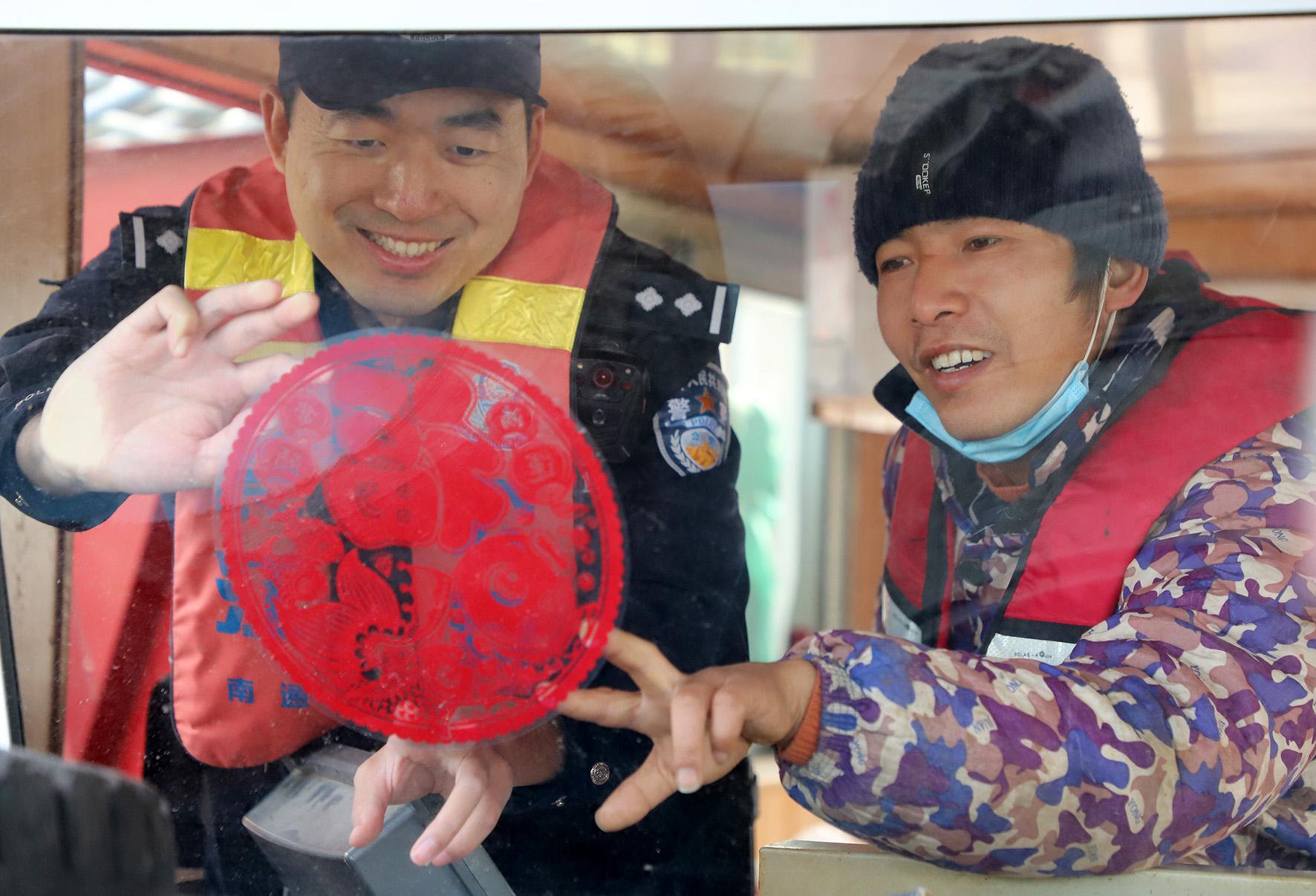 1月16日,長江航運公安局南通分局通州派出所組織警力對靠泊作業(yè)船舶進行安全巡查,并送上新春祝福。