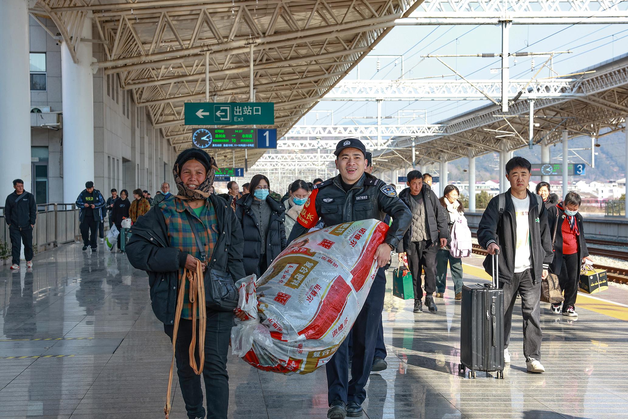 圖為1月18日,臺州火車站派出所民警幫助旅客搬運(yùn)行李。