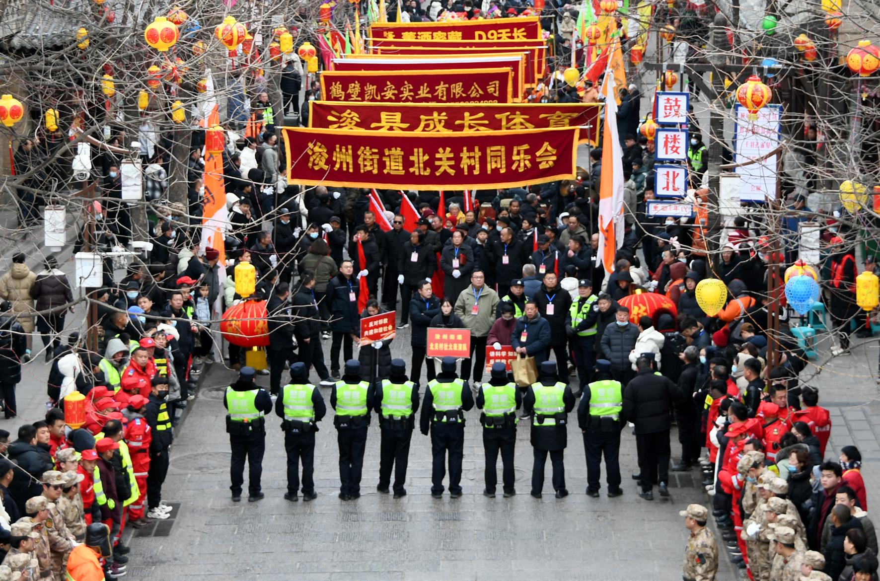 2月6日,河南省??h公安局民警輔警在正月古廟會現(xiàn)場執(zhí)勤。
