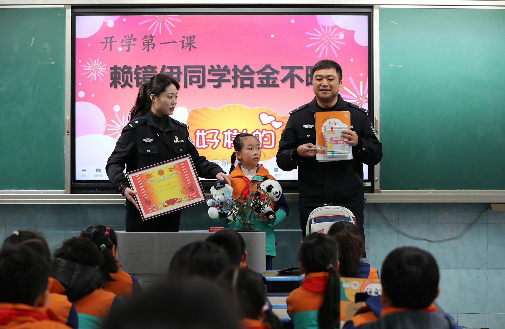 2月14日,安徽省寧國(guó)市公安局西津派出所借助開學(xué)“第一課”開展“送獎(jiǎng)進(jìn)課堂”思政教育。民警在表?yè)P(yáng)拾金不昧學(xué)生的同時(shí),教育引導(dǎo)同學(xué)們要傳承弘揚(yáng)中華民族傳統(tǒng)美德,爭(zhēng)做新時(shí)代好少年。