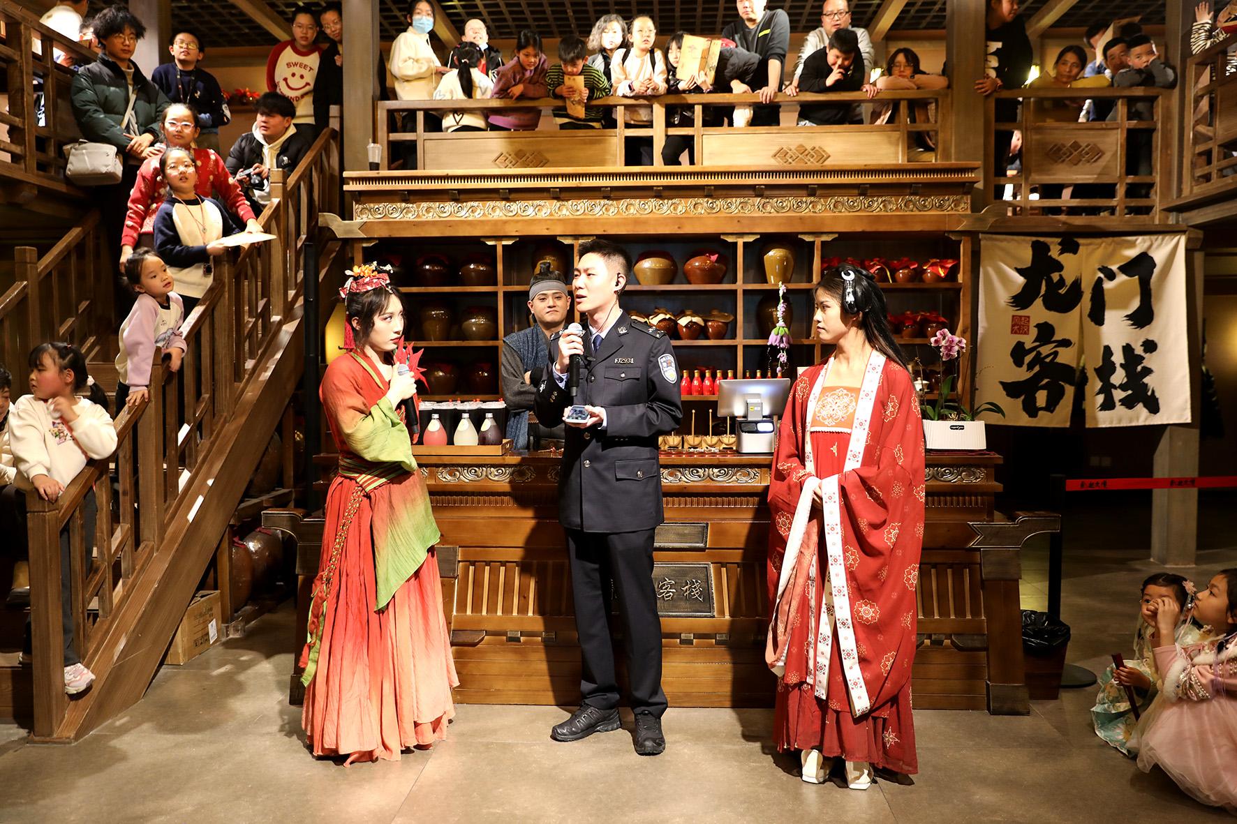 2月21日,甘肅省蘭州市公安局?jǐn)y手招商銀行在蘭州中心風(fēng)起大漢·沉浸式演藝街區(qū),開展“穿越古今·暢聊反詐”線上+線下反詐宣傳活動,兩個小時直播,20.5萬人在線互動觀看,游客紛紛駐足互動參與。