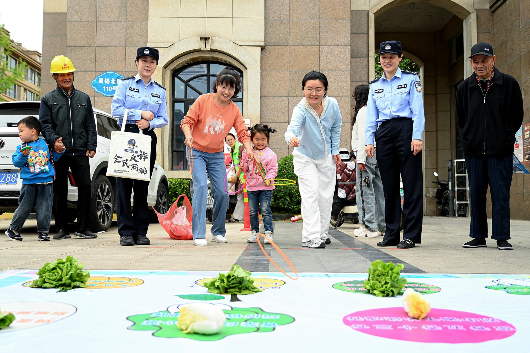 圖為群眾在印有“詐騙套路”的地墊上進(jìn)行有獎套圈活動。