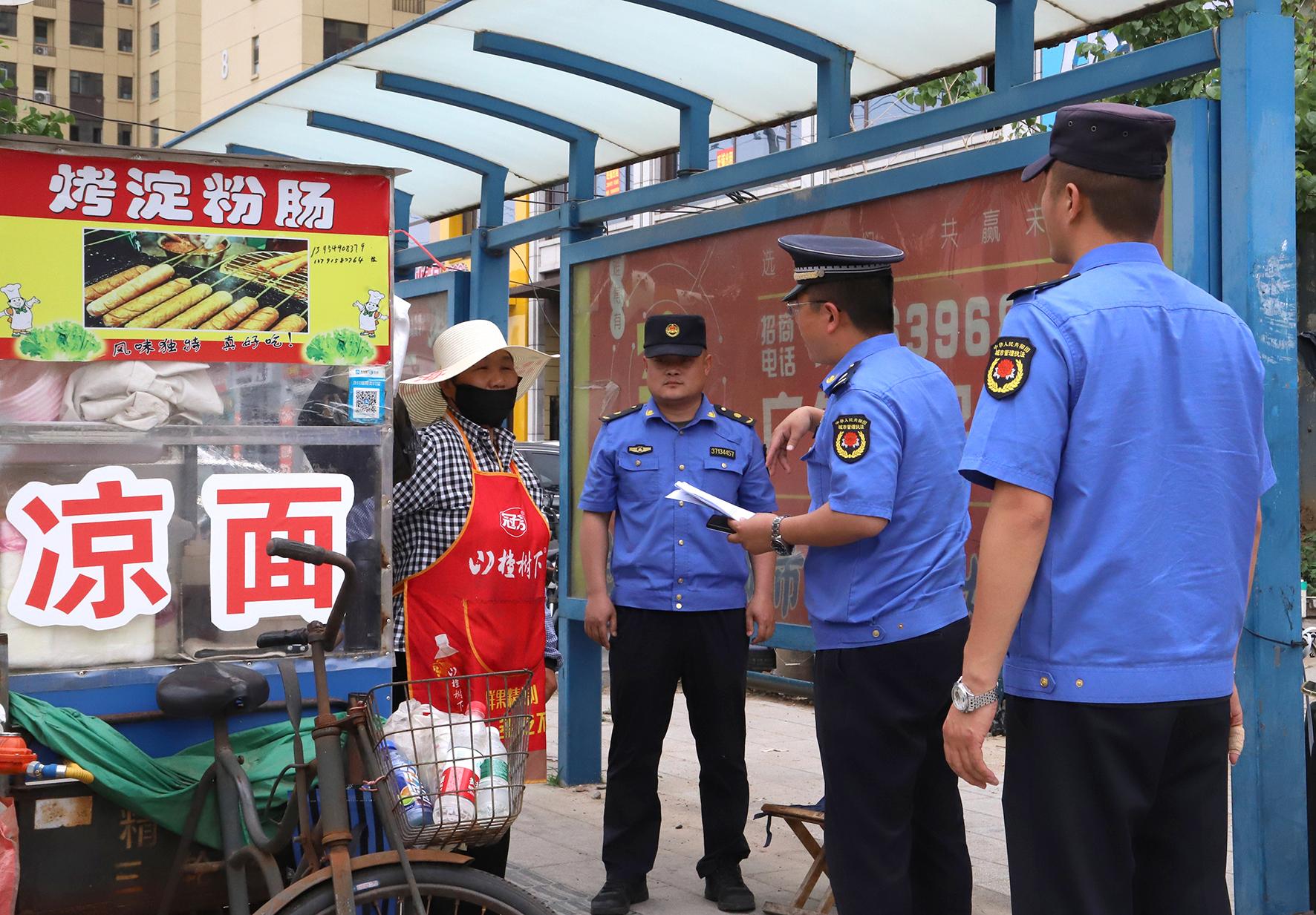 6月3日,山東省郯城縣綜合執(zhí)法人員對(duì)一個(gè)高考考點(diǎn)附近的流動(dòng)商販進(jìn)行勸導(dǎo)。