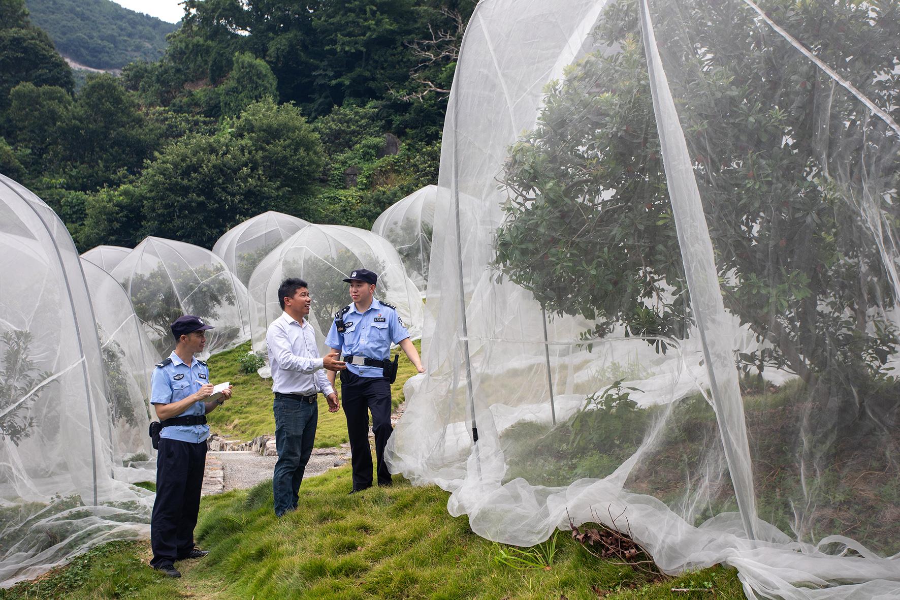 6月21日,浙江省臺(tái)州市公安局黃巖分局江口派出所民警輔警在東岙村楊梅采摘園巡邏走訪(fǎng)。
