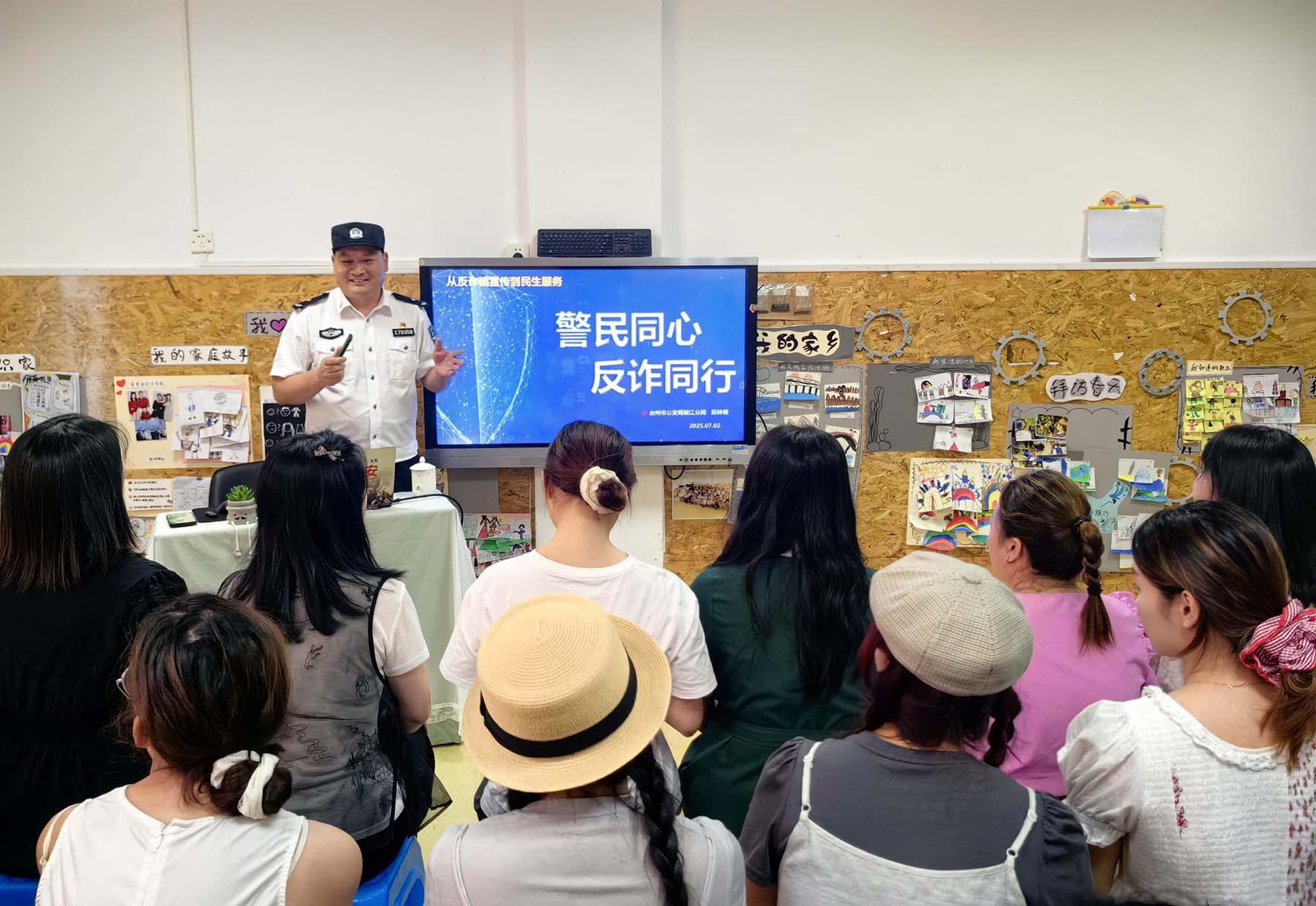 7月2日,全國優(yōu)秀人民警察、二級英模、浙江省臺州市公安局椒江分局海門派出所社區(qū)民警阮林根走進(jìn)幼兒園,開展以“警民同心 反詐同行”為主題的反詐宣傳活動。