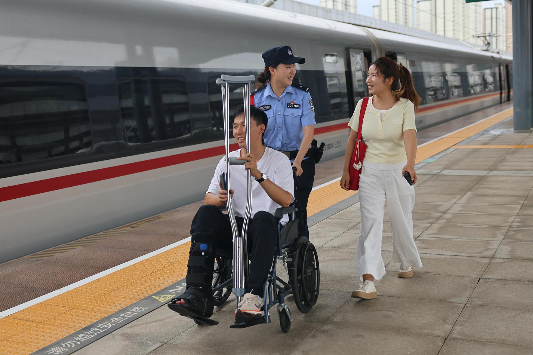 圖為8月5日,民警在站臺(tái)幫助行動(dòng)不便旅客乘車。