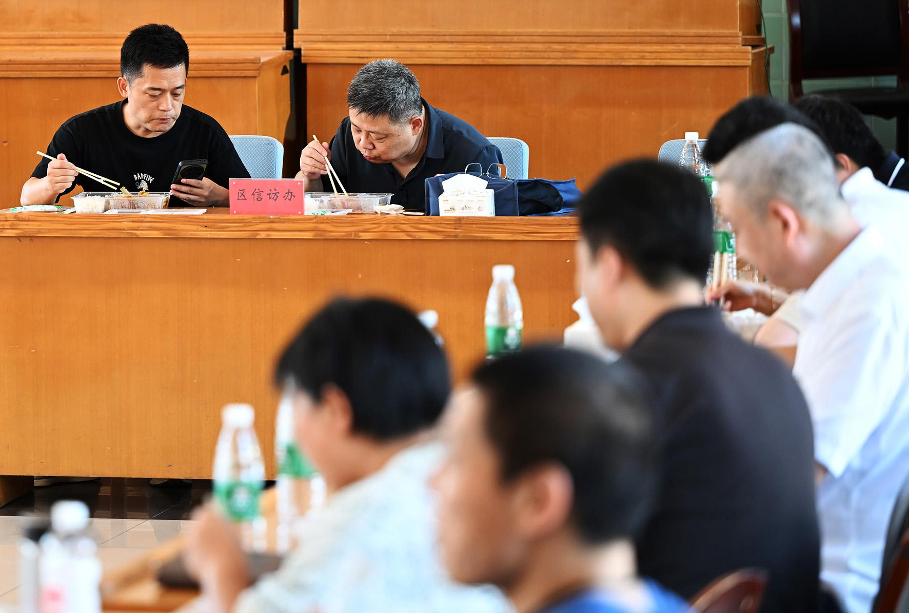 8月6日12時(shí)30分,忙碌了一上午的臨時(shí)“綜治中心”工作人員在辦公桌邊吃盒飯,邊商量著村民反映問題的解決辦法。