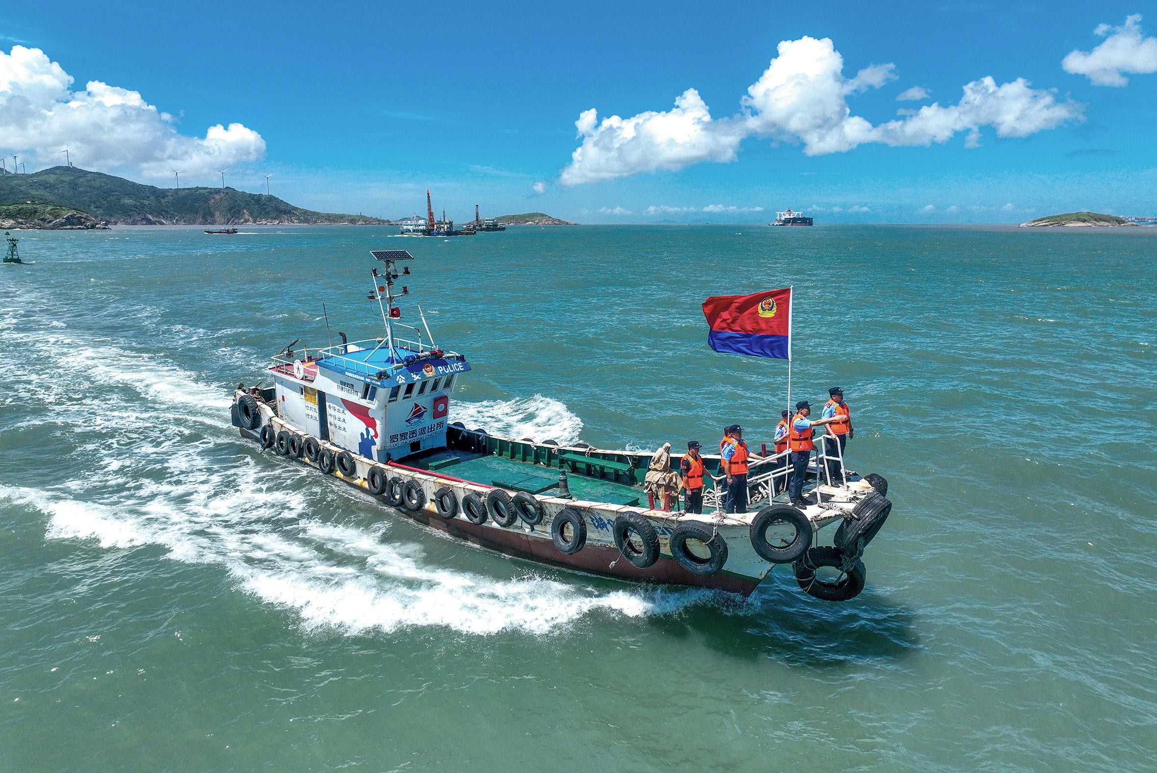 8月15日,浙江省舟山市岱山縣公安局羅家岙派出所民警輔警乘坐“紅帆110”船,開展“警察藍(lán)”守護(hù)“生態(tài)綠”海上巡查行動。