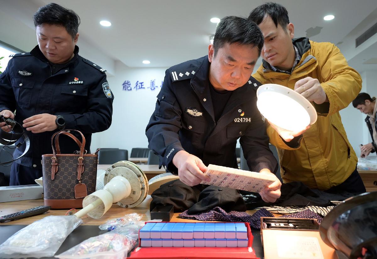 圖為11月4日,刑偵大隊(duì)民警清點(diǎn)詐賭工具。