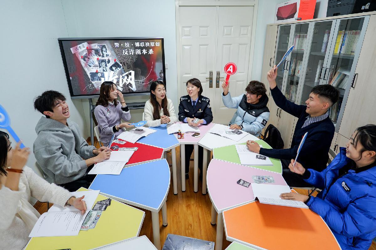 11月17日,山東省煙臺(tái)市公安局萊山分局民警在煙臺(tái)大學(xué)組織開展名為《收網(wǎng)》的劇本殺反詐宣傳,讓學(xué)生們通過(guò)角色扮演,在虛擬交鋒中錘煉現(xiàn)實(shí)防騙能力。