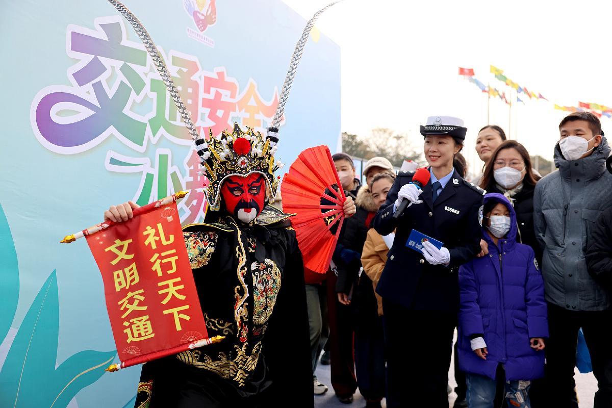 12月2日,在山東省棗莊市光明廣場“交通安全小舞臺”,棗莊市公安局市中分局交通管理大隊(duì)民警利用傳統(tǒng)“變臉”表演方式宣傳交通安全知識。