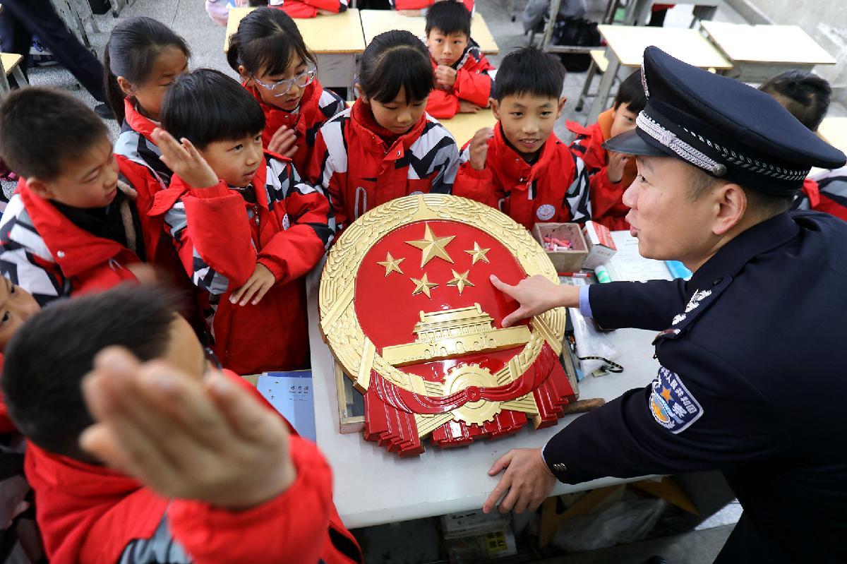 12月2日,在江蘇省連云港市墟溝小學(xué),連云港市公安局墟溝派出所民警為學(xué)生講解憲法知識。