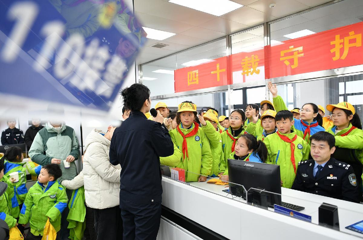 1月9日,江蘇省徐州市公安局鼓樓分局豐財(cái)派出所民警給小學(xué)生介紹警用裝備知識(shí)。當(dāng)日,徐州市星源小學(xué)組織學(xué)生到豐財(cái)派出所參觀,了解警營文化,感受警察風(fēng)采,喜迎中國人民警察節(jié)。