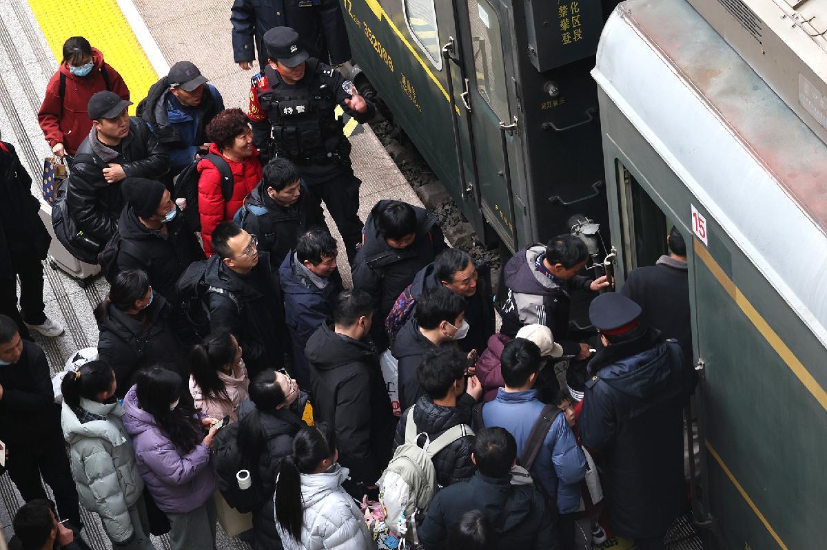 2月2日,在西安火車站站臺(tái),西安鐵路公安處民警在維持乘車秩序。