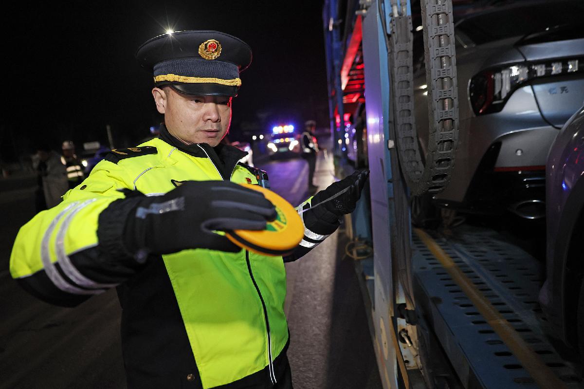 圖為執(zhí)法人員對(duì)車輛裝載數(shù)量、外廓尺寸、安全設(shè)施配備等情況進(jìn)行核查。