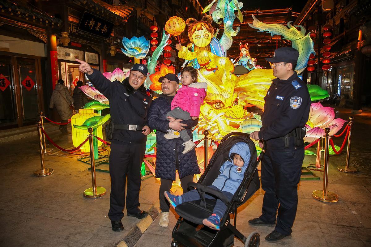 2月25日,山東省濟南市公安局市中分局大觀園派出所民警在大觀園迎春燈會現(xiàn)場執(zhí)勤巡邏,排查安全隱患,為游客提供服務,確保市民度過一個平安喜樂的元宵佳節(jié)。