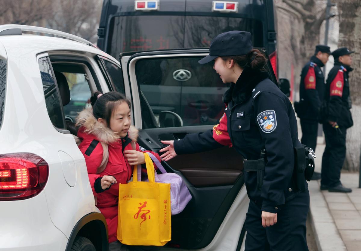 3月2日,遼寧省沈陽市中小學(xué)生迎來新學(xué)期開學(xué)第一天。沈陽市公安局皇姑分局民輔警在轄區(qū)中小學(xué)校護(hù)學(xué)崗執(zhí)勤,守護(hù)學(xué)生平安入校。