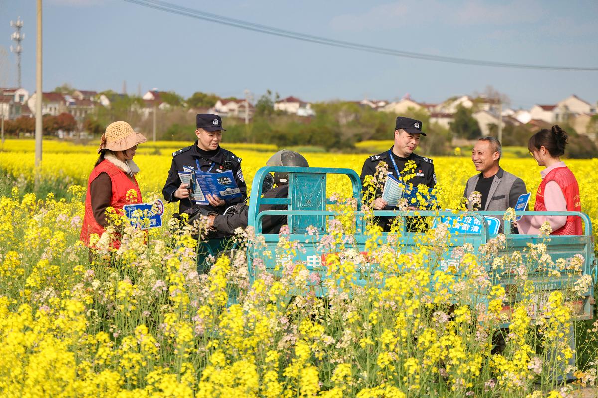 4月1日,安徽省廣德市邱村派出所社區(qū)民輔警走進油菜花田,開展治安巡邏、反詐宣傳。