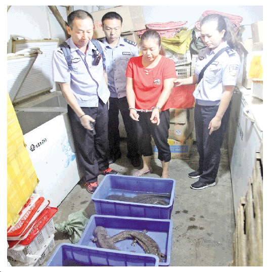 ▲ 犯罪嫌疑人正在向湖南省資興市森林公安民警指認其無證銷售的野生娃娃魚。 本報記者 阮占江 本報通訊員 許志華 攝