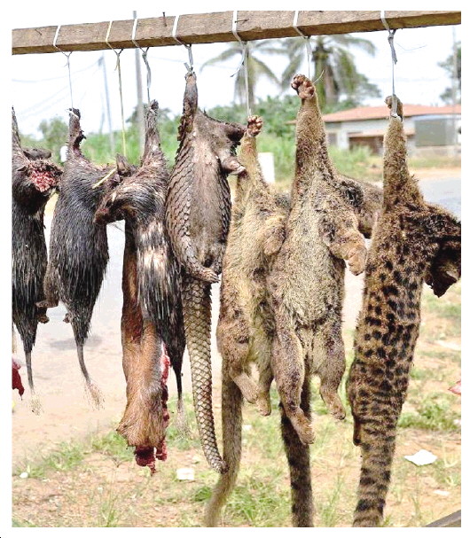▲ 野生動物被殘忍獵殺后,又被掛起來販賣。 (資料圖片)
