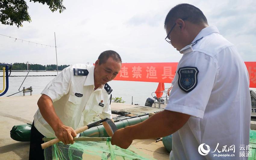 昆明市滇池管理局漁業(yè)行政執(zhí)法處工作人員正在銷毀收繳的違禁漁具。(人民網(wǎng) 虎遵會 攝)