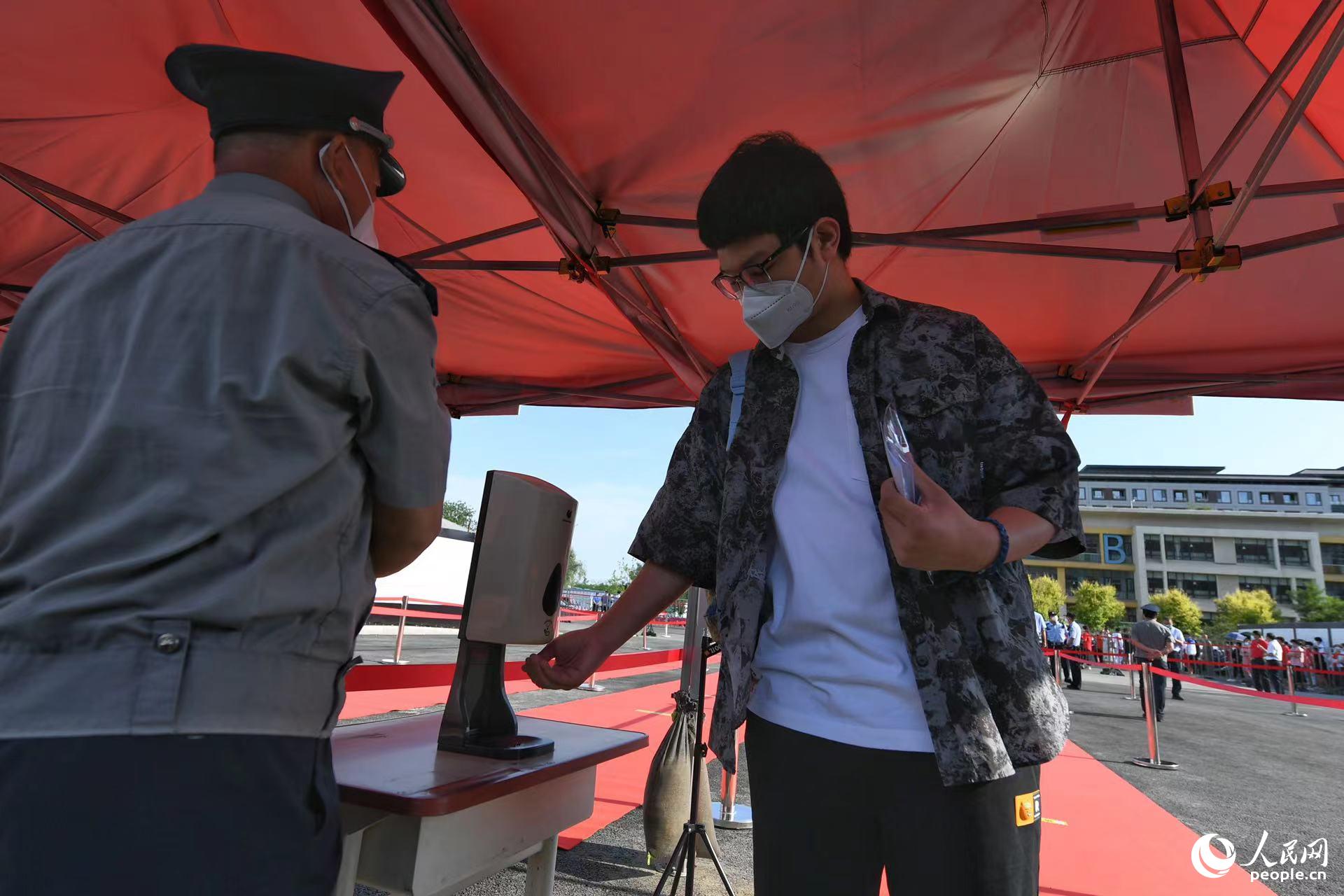 6月7日,北京市人大附中通州校區(qū)考點(diǎn),考生進(jìn)入考場(chǎng)前,對(duì)手部進(jìn)行消殺。人民網(wǎng)記者 翁奇羽攝