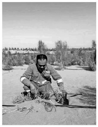 圖為阿克蘇地區(qū)的護林員在沙漠檢查滴灌線路。