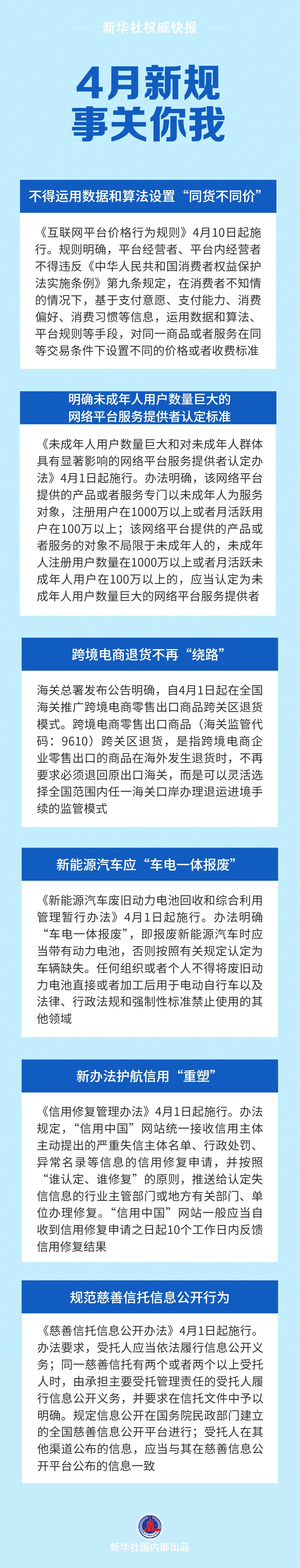 不得運(yùn)用數(shù)據(jù)和算法設(shè)置“同貨不同價(jià)”;明確未成年人用戶數(shù)量巨大的網(wǎng)絡(luò)平臺服務(wù)提供者認(rèn)定標(biāo)準(zhǔn);跨境電商退貨不再“繞路”……4月新規(guī),事關(guān)你我,一起來看。