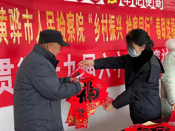 近日,河北省黃驊市人民檢察院干警來到羊三木回族鄉(xiāng)三虎莊村,開展“鄉(xiāng)村振興·檢察同行”春聯送?;顒?。該院已連續(xù)多年開展送福活動,為農村精神文明建設貢獻檢察力量。圖為檢察干警向村民贈送春聯。 本報記者 周宵鵬 本報通訊員 李宴俊 攝