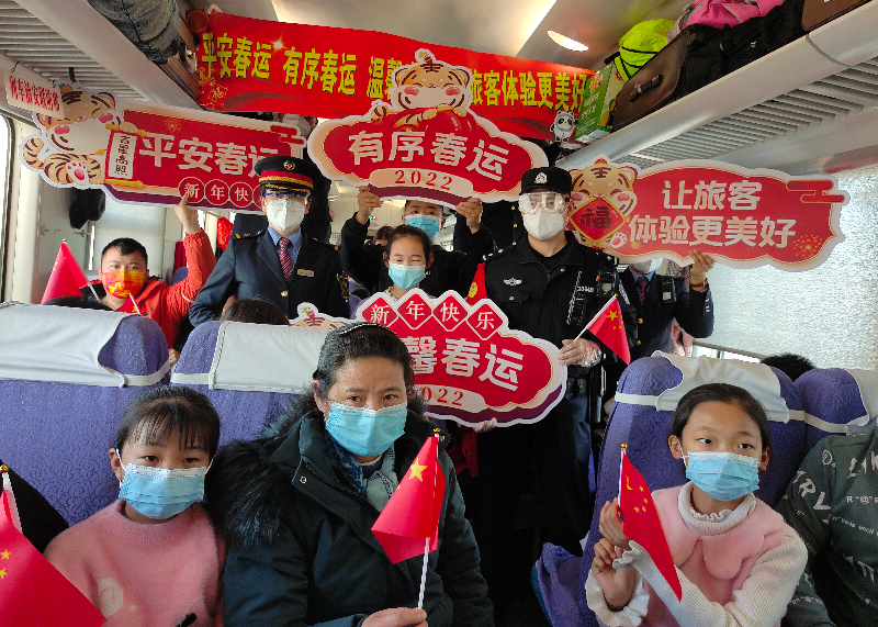 春運(yùn)以來(lái),烏魯木齊鐵路公安局庫(kù)爾勒公安處乘警支隊(duì)民警用情用心,認(rèn)真落實(shí)消防、安檢職責(zé),維護(hù)好列車秩序,為廣大旅客營(yíng)造一個(gè)安全、溫馨的乘車環(huán)境。圖為近日,由喀什發(fā)往成都的k454次列車車廂里,乘警帶領(lǐng)列車工作人員和乘客一起開展春運(yùn)安全倡議活動(dòng)。