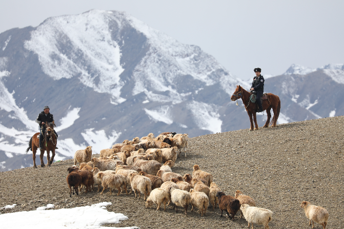 近日,隨著氣溫逐步回暖,新疆維吾爾自治區(qū)阿勒泰地區(qū)青河縣的牧民們都陸續(xù)開始了轉(zhuǎn)場作業(yè)。連日來,阿勒泰邊境管理支隊青河邊境管理大隊阿尕什敖包邊境派出所選派騎馬經(jīng)驗豐富的民警成立“牧羊人”小分隊,深入邊境轄區(qū)幫助牧民們共同放牧,全力保障牧民轉(zhuǎn)場的順利進行。圖為民警助力牧民轉(zhuǎn)場。