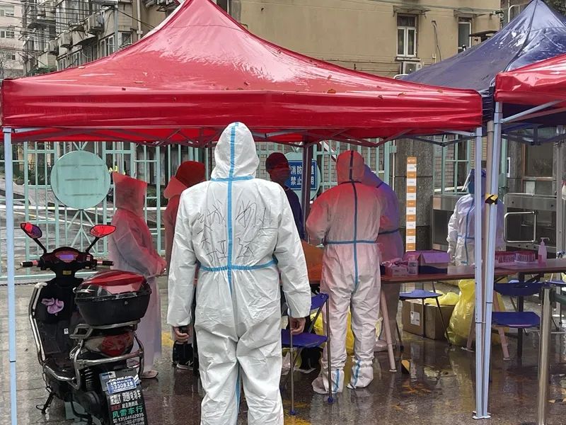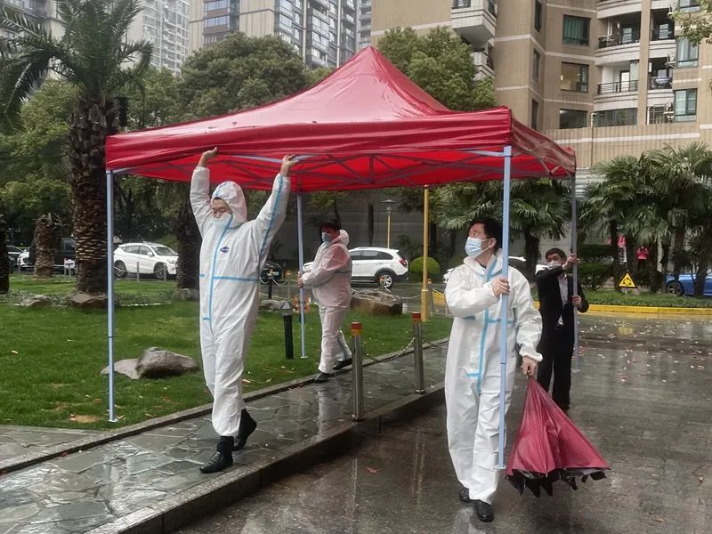 “許多外籍住戶(hù)對(duì)我們的工作評(píng)價(jià)非常高,因?yàn)樗麄儚臎](méi)見(jiàn)過(guò)這樣一支有力的隊(duì)伍?!泵却罕硎?,從凌晨接到核酸篩查的任務(wù),短短的幾個(gè)小時(shí),從無(wú)到有,居委與物業(yè)就完成了臨時(shí)的檢驗(yàn)棚的搭建,一米線設(shè)置、桌椅板凳、引導(dǎo)標(biāo)志、動(dòng)線安排……一支志愿者隊(duì)伍也誕生了。