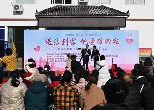 日前,重慶市彭水縣檢察院聯(lián)合縣婦聯(lián)、紹慶街道阿依河社區(qū),開展“檢社同行·共護(hù)未來(lái)”之“送法到家·把愛(ài)帶回家”普法活動(dòng),通過(guò)自創(chuàng)法治小品、快板和法律知識(shí)有獎(jiǎng)競(jìng)答等活動(dòng),為社區(qū)居民講解家庭教育促進(jìn)法和“雙減”政策,教家長(zhǎng)“依法帶娃”。當(dāng)天,三方還會(huì)簽了家庭教育指導(dǎo)工作聯(lián)動(dòng)機(jī)制。