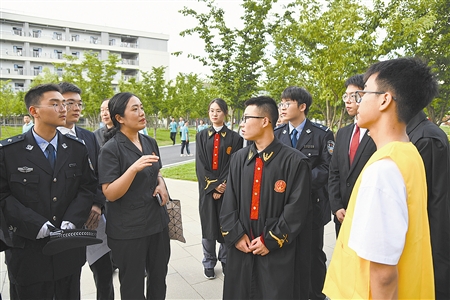隨著“審判長”敲響法槌,以未成年被告人習某航故意傷害案為藍本的模擬法庭宣布開庭。庭審中,“書記員”宣布法庭紀律,“公訴人”宣讀起訴書,“被告人”答辯,法庭調(diào)查、法庭辯論、法庭教育及當庭“宣判”等程序有序進行。