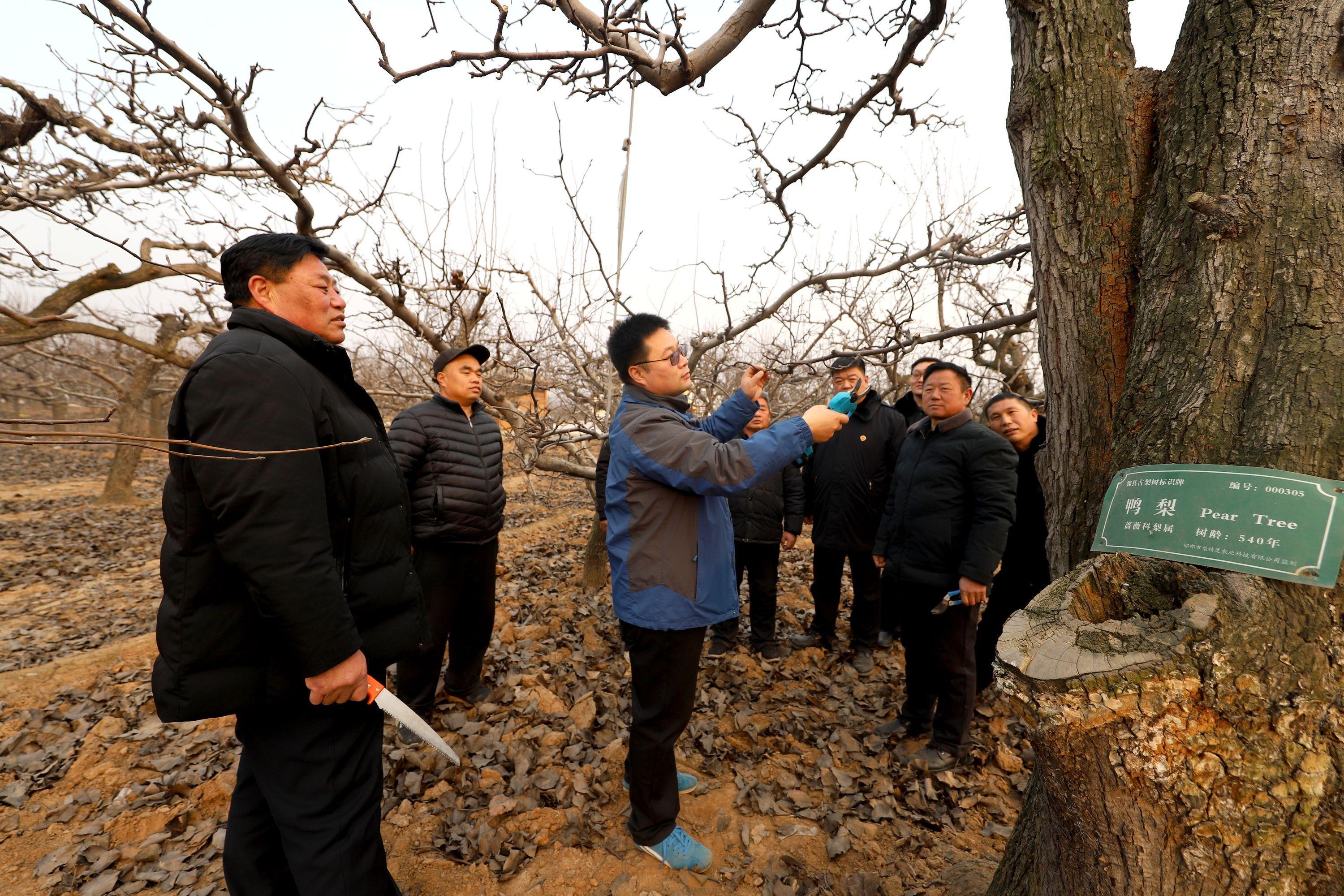 1月4日,河北省魏縣人民檢察院公益訴訟檢察官邀請(qǐng)?jiān)摽h林果服務(wù)中心果樹(shù)專(zhuān)家來(lái)到東南溫村梨園,指導(dǎo)梨農(nóng)對(duì)古梨樹(shù)進(jìn)行冬季剪枝整枝管理,為明年古梨樹(shù)豐產(chǎn)、梨農(nóng)增收做好準(zhǔn)備。圖為專(zhuān)家向梨農(nóng)講解古梨樹(shù)的修剪要求和技巧。