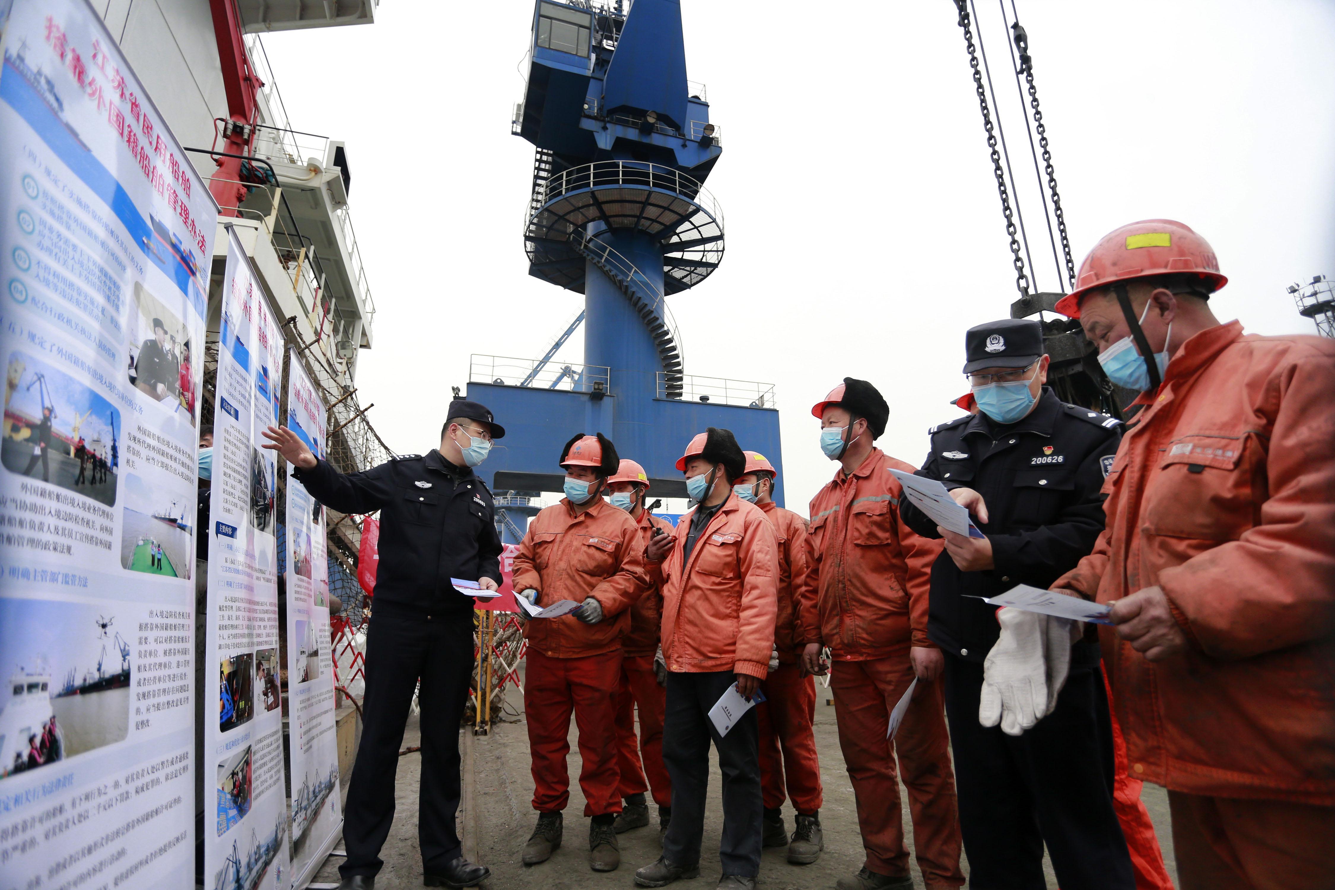 《江蘇省民用船舶搭靠外國籍船舶管理辦法》將于4月1日起施行。2月23日,江蘇南京港出入境邊防檢查站組織普法小分隊(duì)深入港口船企和碼頭,開展普法宣傳活動。圖為普法小分隊(duì)成員向碼頭工人普及新規(guī)。 本報通訊員 張光偉 章善玉 攝