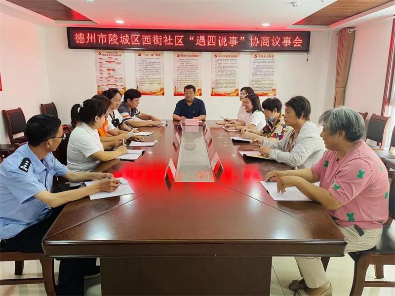 圖為陵城區(qū)建立“遇四說事”協(xié)商議事機(jī)制,每月4日、14日、24日由社區(qū)召集居民代表、業(yè)委會(huì)、物業(yè)召開會(huì)議,暢通問題反饋渠道,共商難題破解辦法