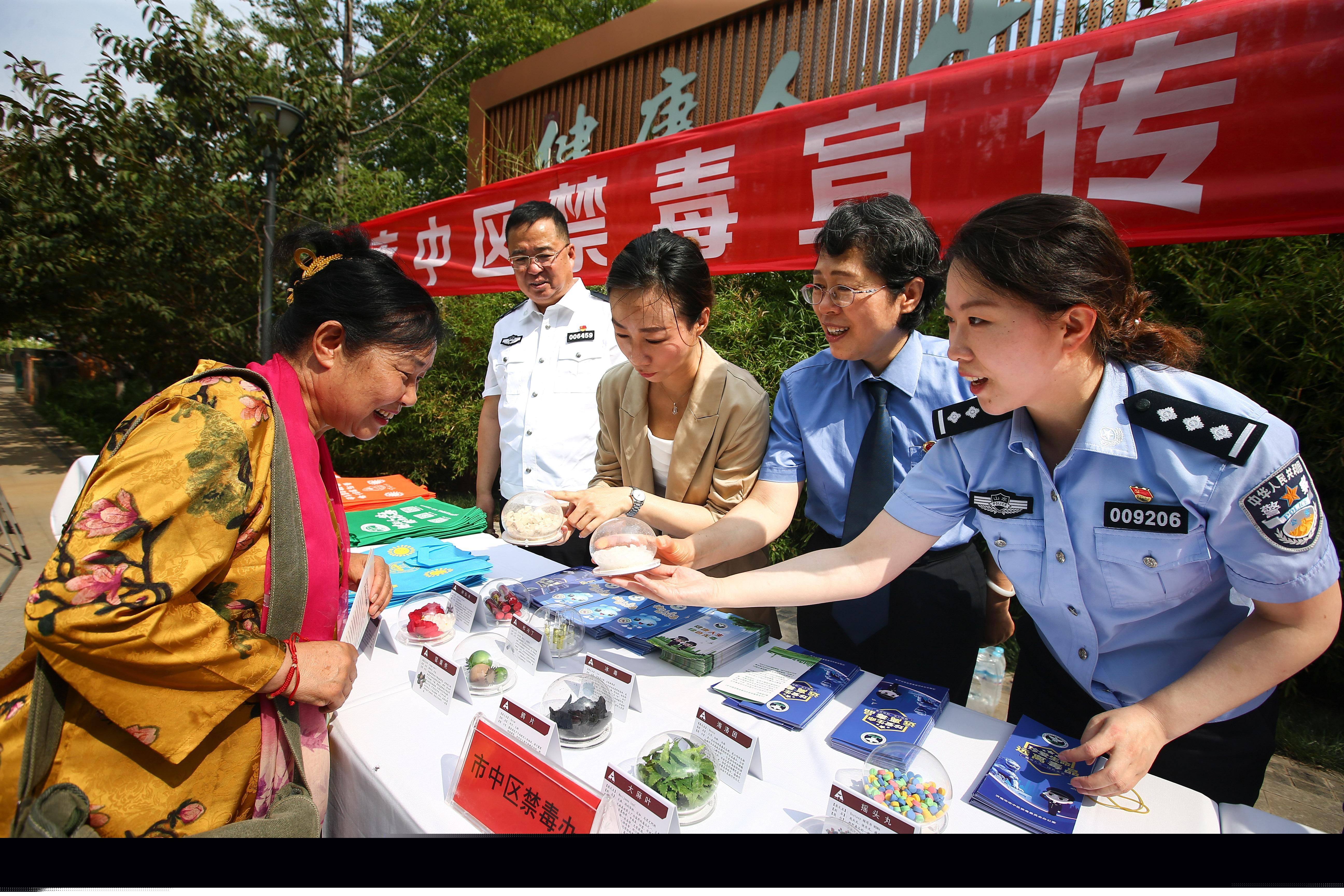 6月16日,山東省濟(jì)南市市中區(qū)禁毒辦聯(lián)合濟(jì)南市公安局市中區(qū)分局、市中區(qū)法院、市中區(qū)檢察院在轄區(qū)開展禁毒宣傳進(jìn)社區(qū)活動(dòng)。工作人員和志愿者通過設(shè)立宣傳展板,發(fā)放宣傳資料和展示仿真毒品模型等方式,向群眾普及禁毒知識(shí),提升群眾禁毒意識(shí)。圖為工作人員向群眾展示仿真毒品模型。