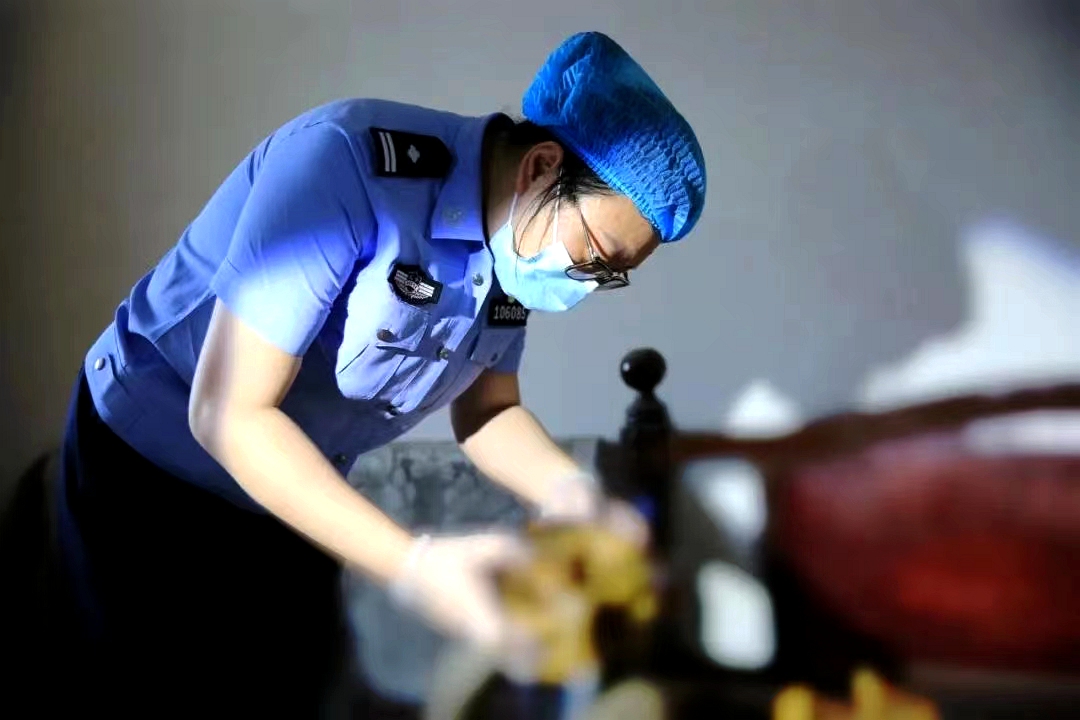 一副手套一個(gè)口罩,沒(méi)有防毒面具沒(méi)有防護(hù)服,在場(chǎng)的同事都為這名剛剛穿上白大褂的“黃毛丫頭”捏了一把汗。查看了現(xiàn)場(chǎng)環(huán)境之后,她時(shí)而站立時(shí)而俯身進(jìn)行拍照,觀察尸斑、尸僵以及腐敗的程度,最后蹲在了尸體前,側(cè)身從勘查箱中拿出鑷子、放大鏡、試管以及證物袋等工具,尋找可能存在的傷痕點(diǎn),小心翼翼地提取血液、體液以及殘留物,結(jié)合氣候和室內(nèi)環(huán)境給出綜合判斷。隨著時(shí)針滴答滴答向前,死者生前受侵害的可能性逐步被排除,真相也在逐步走近——“死者生前沒(méi)有受到侵害的跡象,基本可以排除他殺可能”。就在所有人都屏息凝視的時(shí)候,龐宜婧堅(jiān)定地回答打破寂靜。