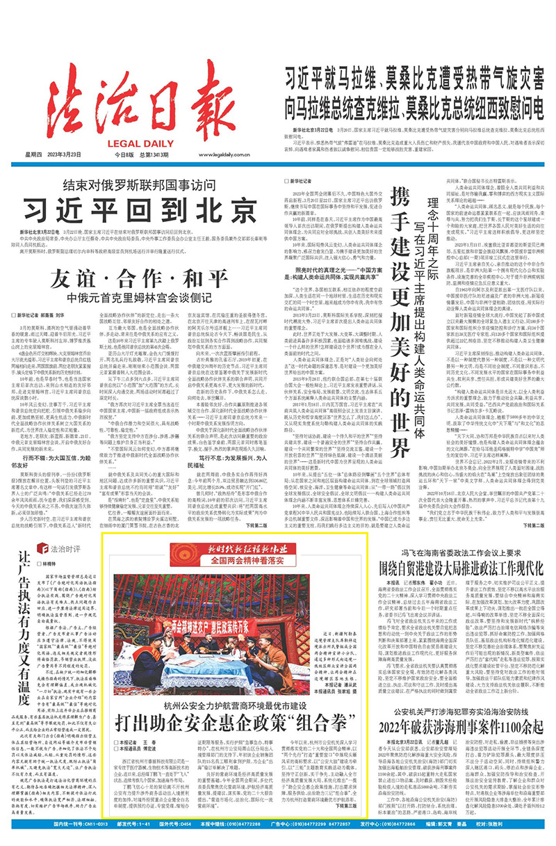 2023年11月9日,“新時(shí)代新征程·‘楓橋經(jīng)驗(yàn)’新實(shí)踐”專欄在《法治日報(bào)》1版開欄,共推出4篇專家解讀、6篇省級(jí)政法委書記署名文章和50余篇“楓橋式工作法”先進(jìn)單位事跡稿件