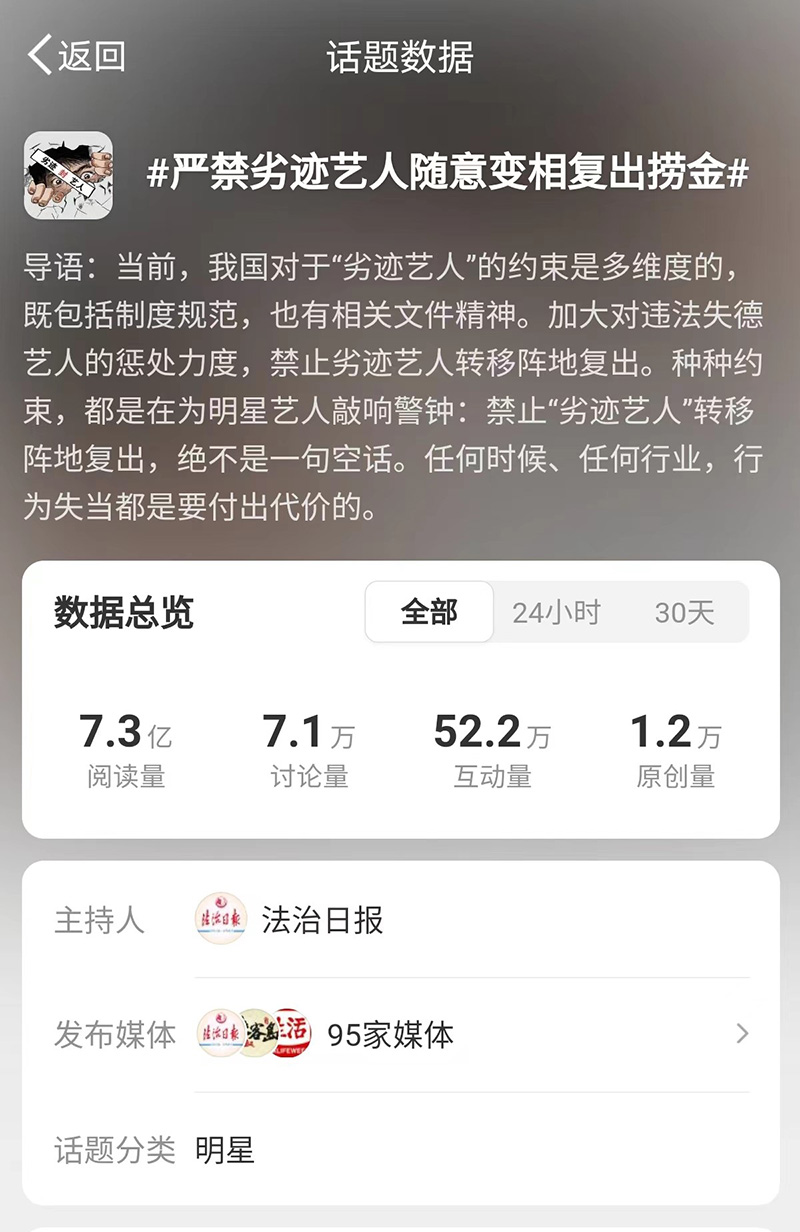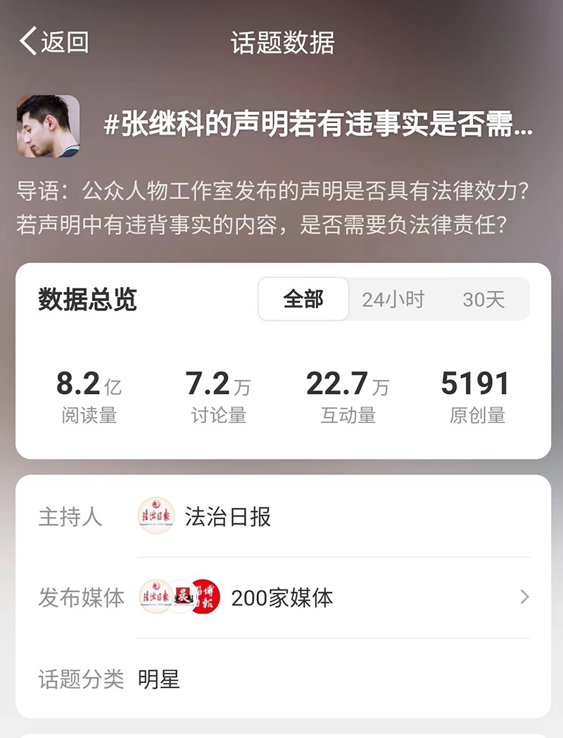 #張繼科的聲明若有違事實(shí)是否需要擔(dān)責(zé)##嚴(yán)禁劣跡藝人隨意變相復(fù)出撈金#兩個(gè)話題閱讀量分別達(dá)到8.2億次、7.3億次