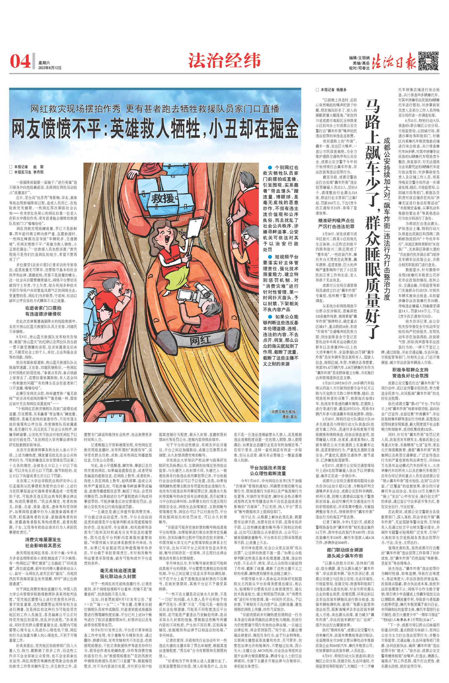 緊盯熱點(diǎn)話題,找準(zhǔn)法治切入點(diǎn),做好全鏈條考量,確保專業(yè)快速發(fā)聲,有力有效引導(dǎo)社會(huì)輿論。持續(xù)做好一版“法治時(shí)評(píng)”欄目,全年推出約200篇評(píng)論。針對四川一幼童遭大型犬撕咬、“婆孫插隊(duì)門”等突發(fā)社會(huì)熱點(diǎn)新聞,及時(shí)解析背后的各種法律問題,為公眾提供主流價(jià)值、觀點(diǎn)和思考。淄博燒烤、“村超”“村BA”爆火后,組織記者深入現(xiàn)場調(diào)查采訪,探尋基層社會(huì)治理創(chuàng)新模式。