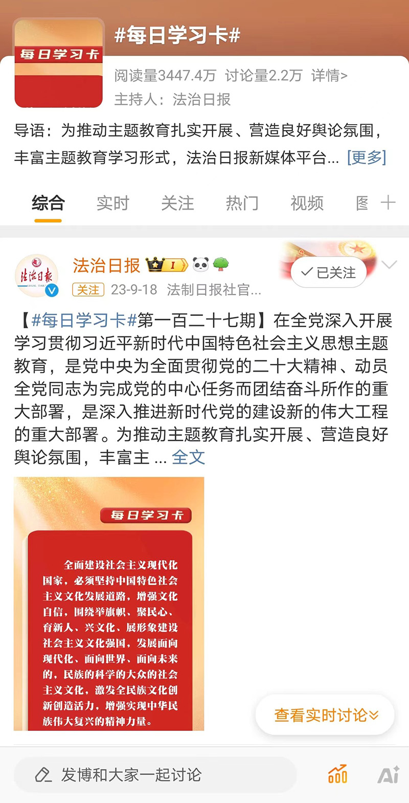 為豐富主題教育形式,法治日報(bào)微博開設(shè)#每日學(xué)習(xí)卡#原創(chuàng)話題,以圖卡形式陸續(xù)推送《習(xí)近平著作選讀》《習(xí)近平新時(shí)代中國特色社會(huì)主義思想專題摘編》等著作中的重要論述。自2023年5月中旬至9月底共推送138期內(nèi)容