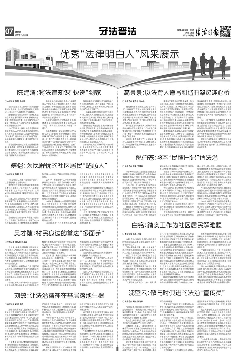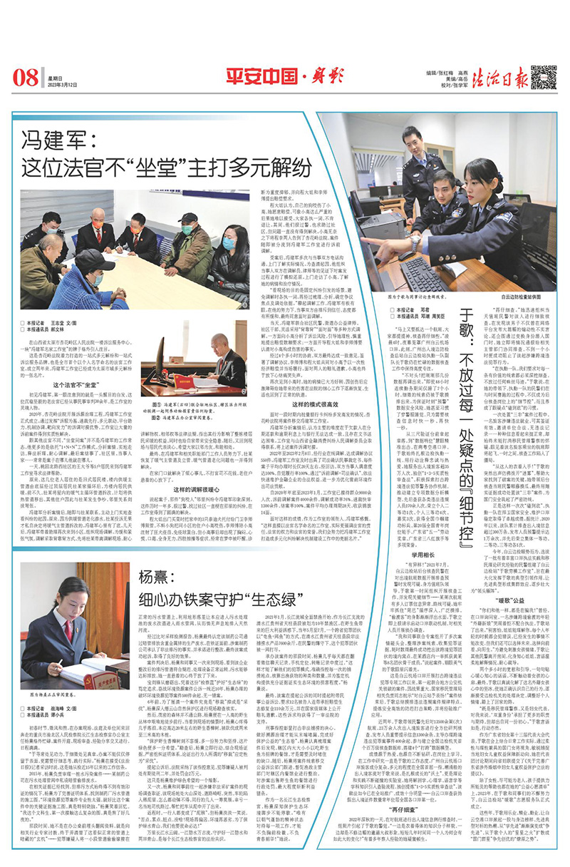將更多筆墨對準(zhǔn)基層一線,推出一系列有態(tài)度、有溫度、有力度、有深度的新聞報(bào)道。《法治日報(bào)》用3個(gè)專版集中展示優(yōu)秀“法律明白人”扎根基層、助力社會(huì)治理的生動(dòng)故事?!斗ㄖ稳請?bào)·社區(qū)版》全年共推出52塊“平安中國·身影”版,展現(xiàn)170余名基層法治工作者的堅(jiān)持、付出與擔(dān)當(dāng)。