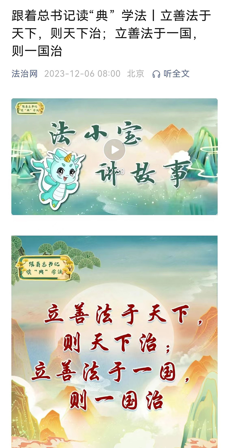 為進(jìn)一步強(qiáng)化習(xí)近平法治思想宣傳闡釋,對法治網(wǎng)“習(xí)近平法治思想”頻道進(jìn)行全面改版;繼續(xù)推出“跟著總書記讀‘典’學(xué)法”系列融媒體產(chǎn)品,深入宣傳習(xí)近平法治思想,傳承中華優(yōu)秀傳統(tǒng)法律文化;全年制作992期《法治金句》節(jié)目,被學(xué)習(xí)強(qiáng)國APP在首頁和“法治中國”“聽法律”兩個(gè)頻道同步推送。